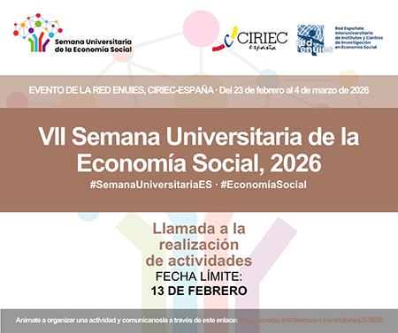 Desde CIRIEC se invita a las distintas estructuras de investigación de España e Iberoamérica a organizar una o varias actividades vinculadas a la Economía Social y sus familias, en formato presencial u online, cada una desde su propio centro, facultad o universidad, en alguno de los días propuestos, y así completar conjuntamente una amplia agenda de actos que visibilice la Economía Social desde el ámbito universitario, para así formar parte de la 7ª Semana Universitaria de la Economía Social, que este año tendrá lugar del 23 de febrero al 4 de marzo.