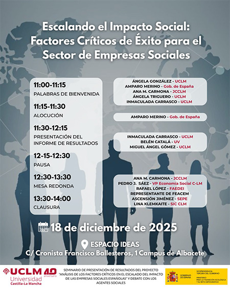 La Universidad de Castilla-La Mancha celebra el próximo 18 de diciembre en el Campus de Albacete el seminario “Escalando el Impacto Social: Factores Críticos de Éxito para el Sector de Empresas Sociales”, donde presentará los resultados del proyecto “Análisis de los factores críticos en el escalado del impacto de las empresas sociales españolas”.