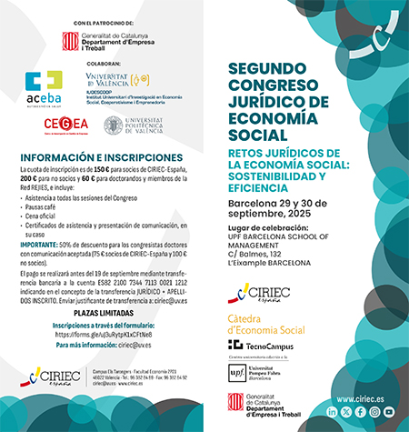 El 2º Congreso Jurídico de CIRIEC-España tendrá lugar los días 29 y 30 de septiembre de 2025 en Barcelona, bajo el lema ‘Retos jurídicos de la economía social: sostenibilidad y eficiencia’. El objetivo de esta gran cita, organizada con la colaboración del Tecnocampus (Mataró) en el UPF Barcelona School of Management, es despertar el interés en este ámbito económico y social por parte de juristas de todas las ramas y orientaciones.